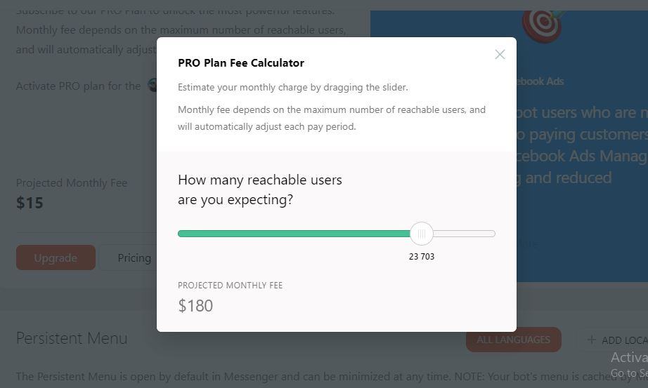 Một điều nữa mà ít ai để ý đó là bạn sẽ bị phụ thuộc vào Chatbot của bên thứ 3 hoàn toàn và sẽ phải trả một khoản phí rất lớn nếu lượng khách hàng trong phễu Chatbot ngày càng đông. Điển hình là Chatfuel sẽ thu phí của bạn là 180 USD/tháng để lên bảng PRO cho hơn 20.000 khách hàng trong phễu @@!