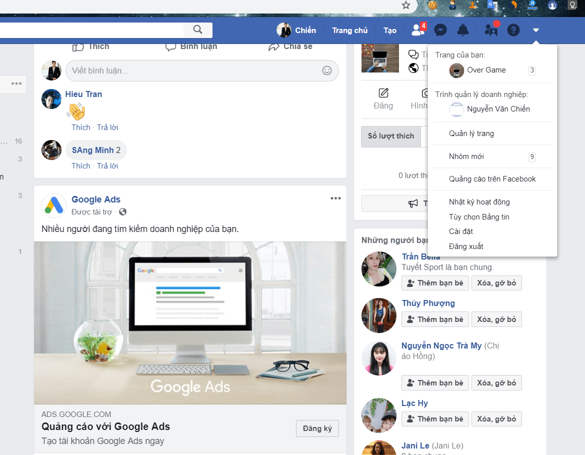 Bước 1: Trong giao diện chính của Facebook, các bạn bấm vào biểu tượng góc trên cùng bên phải ->Các bạn chọn Cài đặt tài khoản