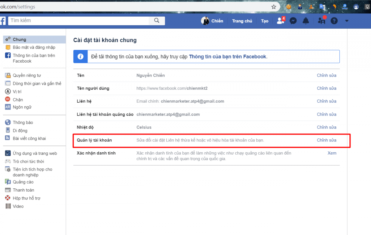 Bước 2: Một hộp thoại hiện lên, các bạn tiếp tục nhấn vào Account Settings (Cài đặt tài khoản) và chọn General (Chung)