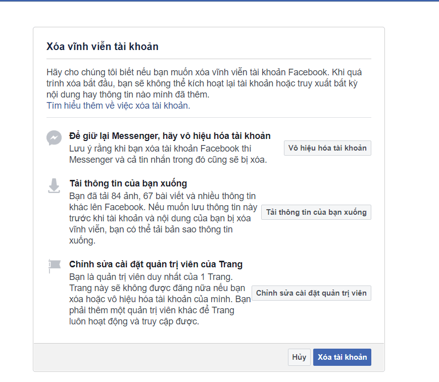 Trên đây là hướng dẫn xóa tài khoản Facebook tạm thời và vĩnh viễn. Các bạn có thể thao tác theo những hướng dẫn bên trên để xóa fb của mình. Lưu ý, việc xóa face vĩnh viễn sẽ không thể khôi phục được, do đó các bạn nên cân nhắc kỹ trước khi thao tác. Trước khi thao tác xóa vĩnh viễn tài khoản Facebook, các bạn nên sao lưu dữ liệu Facebook sang máy tính trước.