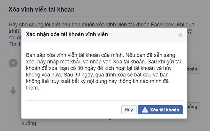 Có thể mất tối đa 90 ngày để xóa dữ liệu được lưu trữ trong các hệ thống sao lưu. Thông tin của bạn sẽ không thể truy cập được trên Facebook trong thời gian này.