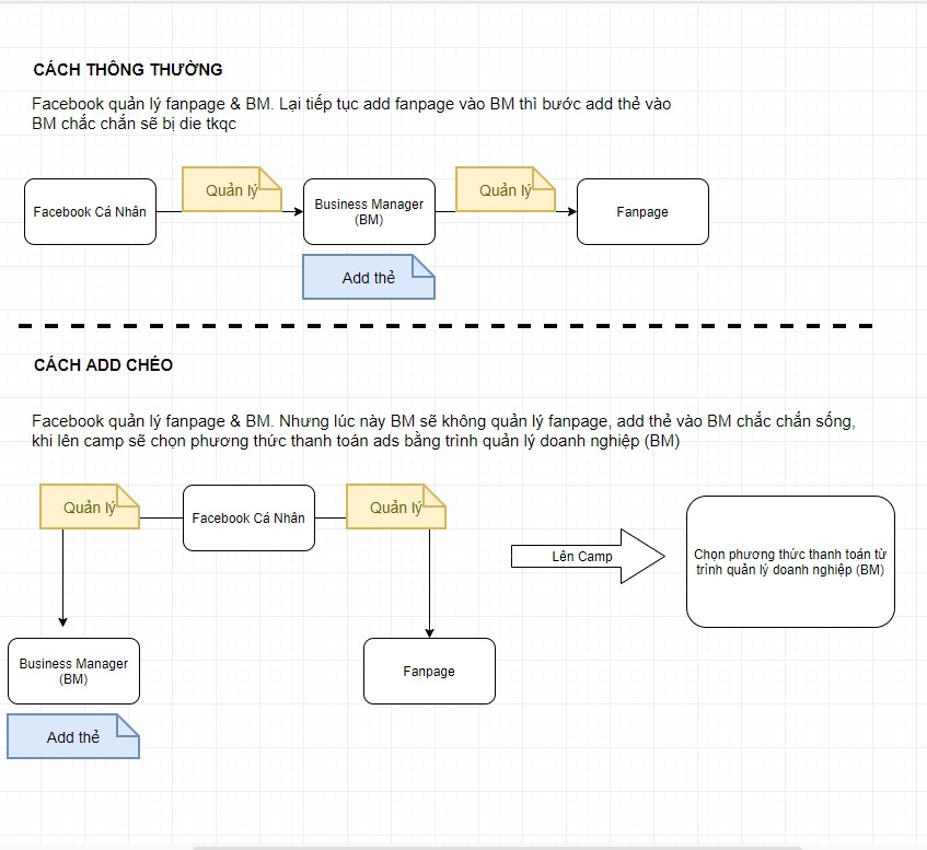 Facebook cá nhân sẽ quản lý fanpage & quản lý BM. Nhưng lúc này BM sẽ không quản lý fanpage, add thẻ vào BM chắc chắn sống, khi lên camp sẽ chọn phương thức thanh toán ads bằng trình quản lý doanh nghiệp (BM)