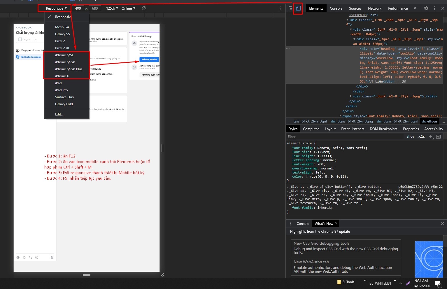 – Sau khi up lên chờ fb sẽ trả lời sau 24-48h. Trường hợp sau 48h vào lại link check điều kiện mà vẫn báo đỏ, vẫn còn nút kháng thì ae tiếp tục gửi giấy tờ lên nhé, đừng nản.1 bug nho nhỏ mà nhiều ae sẽ gặp ở bước xác minh này đó là khi ấn tiếp tục để tải giấy tờ thì sẽ bị xoay vòng & quay trở lại bước cũ. Cách fix: đối với Chrome ae nhấn nút F12 trên bàn phím > nhấn tiếp tổ hợp phím Ctrl + Shift + M, đổi dòng Reposinve thành Iphone 6 Iphone X (mục đích là để đổi trình duyệt máy tính sang Mobile) > Nhấn F5 & tiếp tục sẽ không bị lỗi xoay vòng nữa. Đọc đến bước này ae đã tiết kiệm được 200k tiền thuê dịch vụ xử lý hộ.