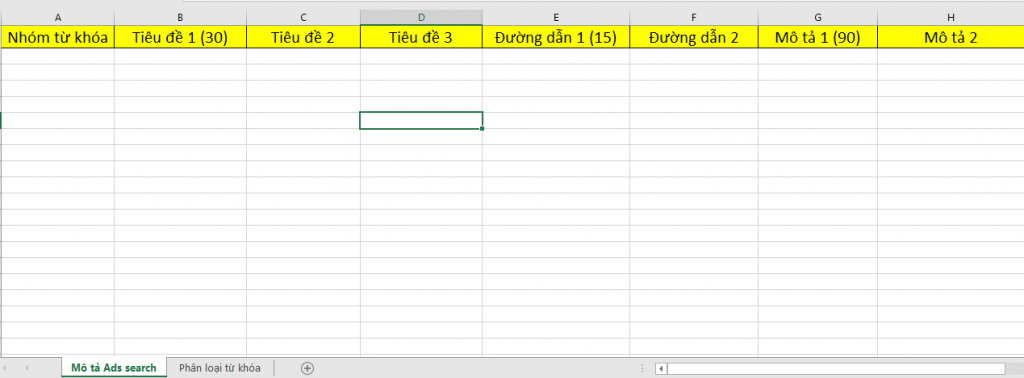 Công việc của bạn lúc này là tạo 1 file excel tạo 7 cột với mỗi cột là 1 mô tả cho quảng cáo như sau