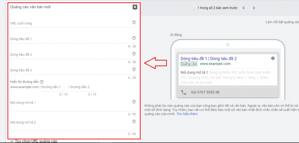 Với mỗi nhóm keyword bạn cố gắng tạo ra ít nhất 3 mẫu ads để khi chạy ads, Google ads sẽ tự đo lường và tìm ra mẫu tốt nhất để cung cấp.